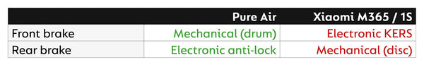 The Pure Air and Xiaomi M365 / 1S have differing approaches when it comes to braking, thanks to the positioning of the motors. The Air’s motor is positioned in the rear wheel, and so the electronic brake that it houses is also situated there too. The M365 / 1S has similar functionality in the front wheel.
