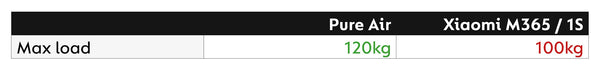 Premium Panasonic battery cells are fitted to the Pure Air, which helps to increase long-term lifespan, while it has a fast 4.5 hour battery recharge time from empty. The Xiaomi M365 / 1S’s battery charges a little more slowly at 5.5 hours.