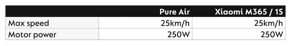 For speed and power – the Pure Air and M365 / 1S are practically identically matched. Both feature a 250W-rated motor, and both max out at a 25km/h top speed.