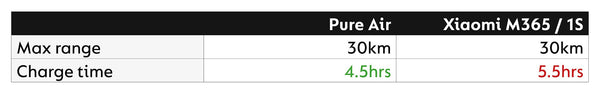 Premium Panasonic battery cells are fitted to the Pure Air, which helps to increase long-term lifespan, while it has a fast 4.5 hour battery recharge time from empty. The Xiaomi M365 / 1S’s battery charges a little more slowly at 5.5 hours.