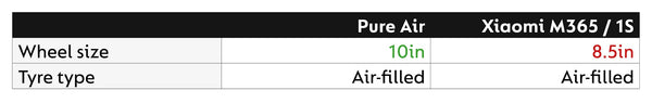 As we highlighted in our previous head-to-head between Xiaomi and Pure e-scooters, the size of the wheels has the biggest part to play when it comes to ride comfort and control over poor surfaces. The Air is fitted with 10-inch wheels (compared to the 8-inch wheels on the M365 / 1S), which makes dealing with bad paving much easier, while riders benefit from higher grip and ride comfort too.