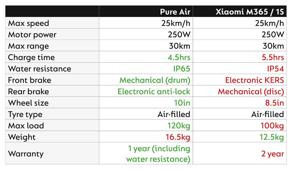 Pure’s warranty for the Air is one year long, but does include coverage for riding in the rain and the 120kg maximum load, which the M365 / 1S’s warranty can’t match.